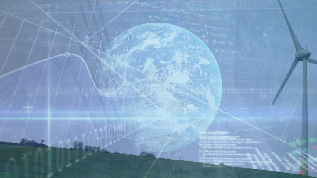 Image depicts Earth's globe amidst animated network connections and illustrated digital data flow, representing interconnected world. Complements projects about digital technology, global business impact, renewable energy usage, or financial analysis presentations. Ideal in resources visualizing global connectivity or themes linking environmental and technological innovations.