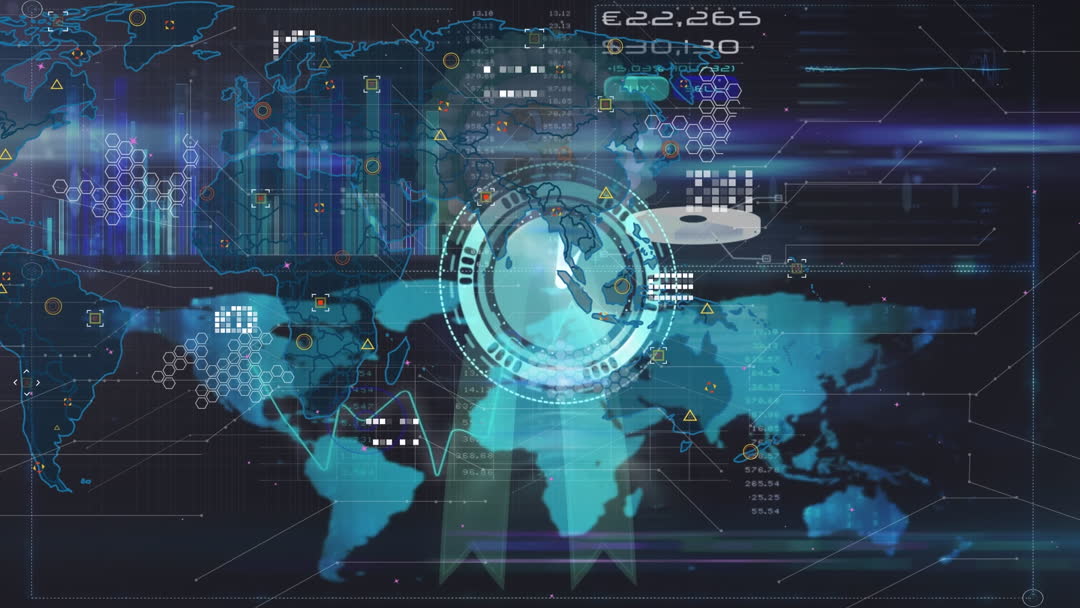 Abstract representation of global data processing using a blue-themed, futuristic world map. Overlay of digital elements symbolizes cutting-edge technology and information flow at a global business scale. This is ideal for illustrating concepts related to digital globalization, financial analytics, or technological innovations, perfect for use in presentations, promotional materials, or educational content discussing global business networks and technological advancements.