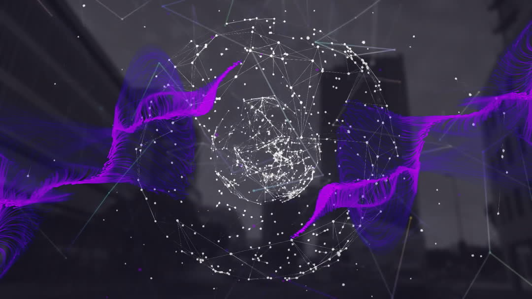 Visual of a connected dots globe and dynamic purple wave patterns representing technological advancement and digital communication. Ideal for use in presentations, tech blogs, or content about globalization, data analysis, and innovation.