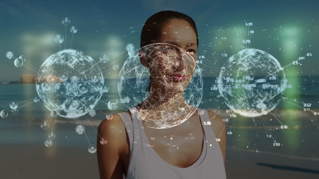 Visual depicts a futuristic holographic interface overlaying a beach scene, emphasizing technology and global connectivity. Ideal for use in technology forecasts, digital commercial layering, presentations on innovation, and educational materials.