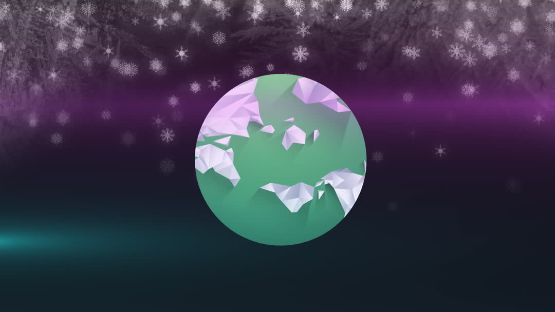 Visual features green and purple digital globe with artistic winter theme, enhanced by lens flare and snowfall. Perfect for use in projects focused on technology, global warming awareness, virtual reality, festive digital backgrounds, futuristic design, or winter-themed promotions.