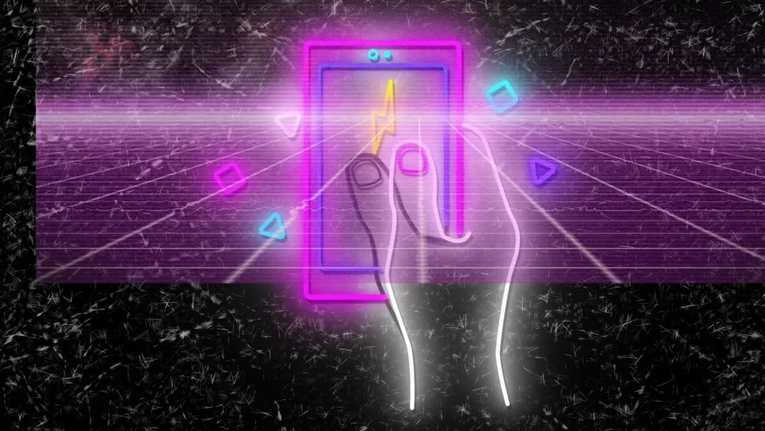 Bright neon depiction of hand interacting with smartphone interface, surrounded by dynamic light shapes. Reflects modern technology themes with futuristic appeal. Ideal for advertising digital services, technology-related media, or illustrating cybernetic environments in presentations and videos.