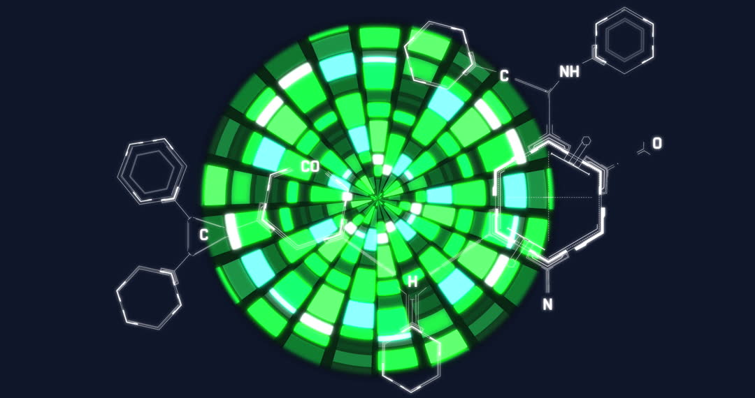 An abstract and colorful digital animation featuring a vibrant green circle surrounded by molecular hexagons on a black background. Evokes a high-tech and futuristic vibe suitable for illustrating concepts related to science, data processing, or technological advancements. This videory can be effectively used in media presentations, educational slides, or as part of digital backdrops for tech-focused events.