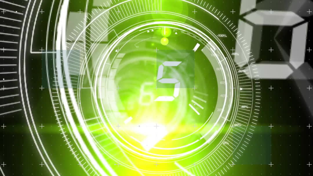 Featuring a high-tech digital countdown with vibrant green hues accompanied by motion graphics, this represents advancements in technology and digital interfaces. Ideal for use in presentations, tech-based projects, video games and promotional materials pertaining to electronic devices and futuristic themes.