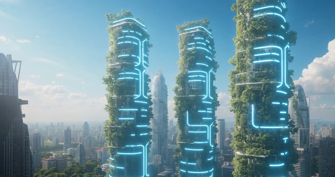 - Futuristic Green Towers with Neon Highlights in Skyline