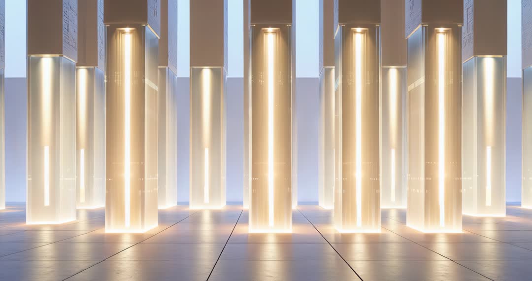AI Generated Image. This scene features a group of pulsating light columns in a sleek, futuristic hall, showcasing advanced technology and architectural brilliance. Ideal for themes related to future tech, modern design, and sci-fi concepts, this videory captures a unique minimalistic environment suited for use in technology advertising, architectural showcases, or visionary storytelling in multimedia projects.