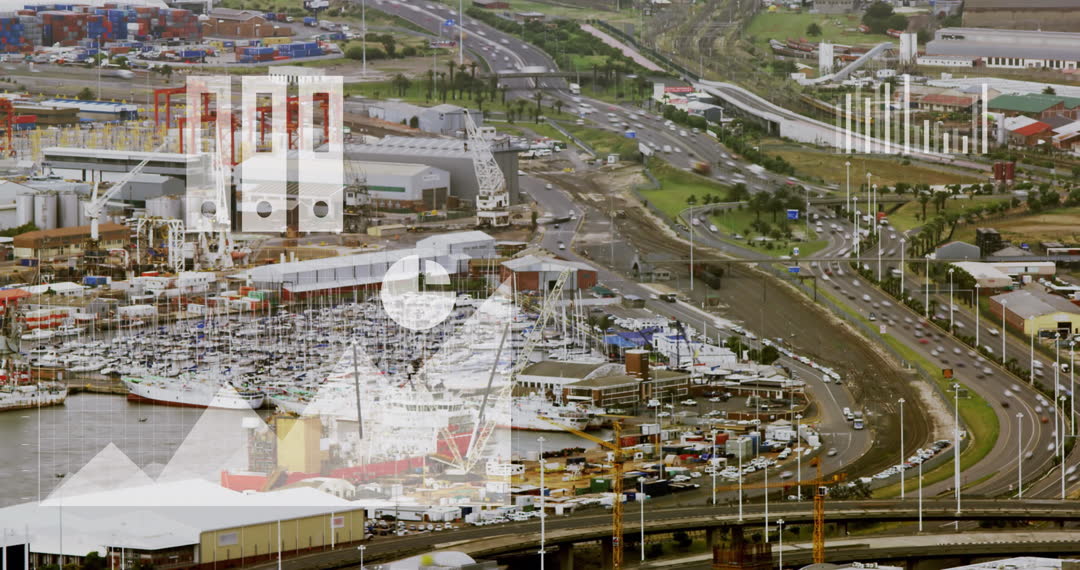 Scene shows a bustling harbor incorporating digital elements to suggest innovative, connected solutions. Suitable for themes involving transportation, technology evolution, business analysis, data visualization.