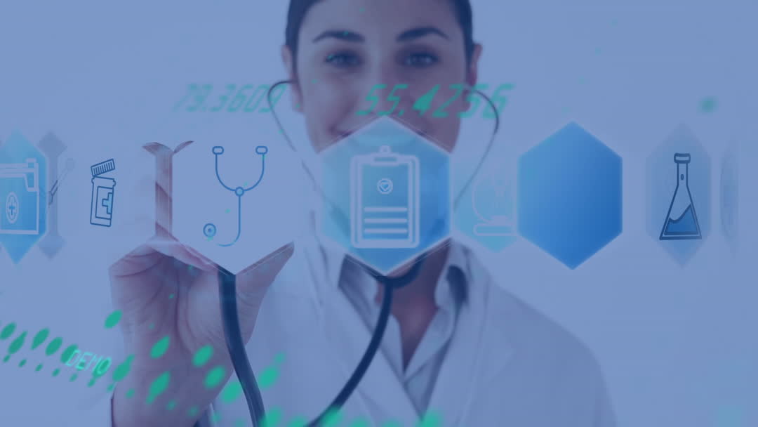 Medical professional interacting with virtual digital interface displaying healthcare data symbols and technology concepts on a blue background. Ideal for illustrating cutting-edge healthcare technology, digital transformation in medicine, and innovative solutions in a medical context. Perfect for use in tech journals, medical presentations, and healthcare marketing materials.