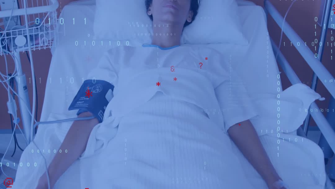 A patient is lying in a hospital bed with a futuristic digital overlay, focusing on a healthcare monitoring device attached to their arm. This scene conveys advanced medical monitoring technology utilizing digital data visualization in a clinical background. Ideal for illustrating modern healthcare technology advancements, medical diagnostics, or futuristic hospital settings.