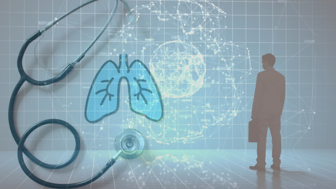 This conceptual visual merges technology and healthcare, depicting a stethoscope and a lung illustration against a backdrop of global digital connections. Ideal for using in futuristic healthcare presentations, articles on medical technology, and business innovations related to global health solutions.