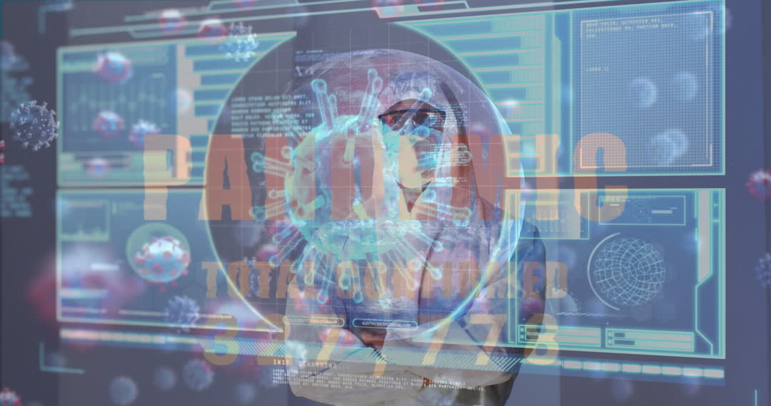 This depicts a futuristic interface with data about COVID-19, featuring a medical professional in PPE and digital virus videory. Useful for illustrating technological advancements in healthcare and data-driven analysis during a pandemic or health crisis.