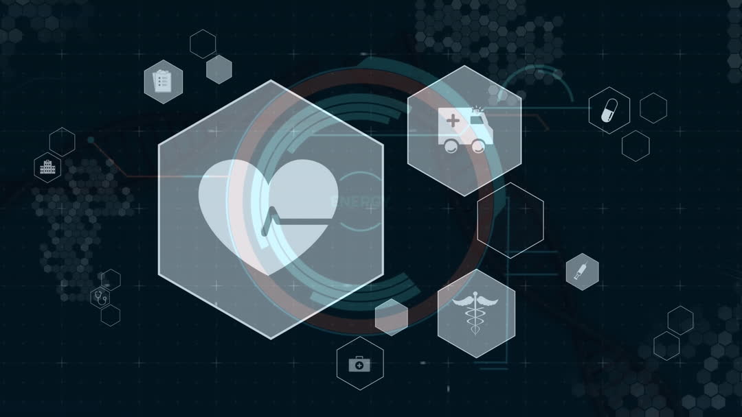 This animation displays futuristic healthcare technology with digital icons over a dark background. Holographic elements symbolize medical advancements and global digital connectivity. Suitable for use in articles, presentations, or content focusing on healthcare innovation, technology, and digital advancements.