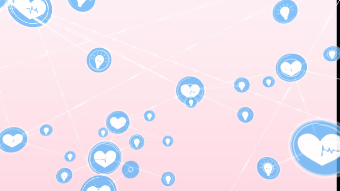 This digital animation features interconnected heart and lightbulb icons set against a soft pink background. The videory represents connectivity, innovation, and sharing of ideas in a digital landscape. It is ideal for use in projects related to online communication, technology innovation, conceptual learning, and digital networking illustrations.