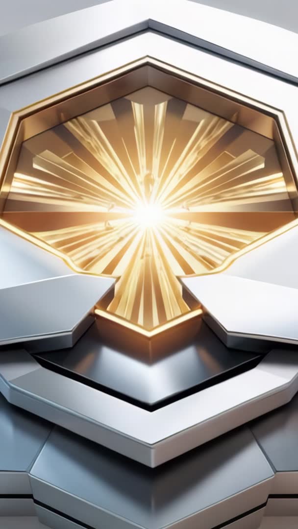 AI Generated Image. Vertical 3D motion clip showing hexagonal chamber revealing glowing golden core, silver panels sliding inward. Bright radial beams emitting from core, creating strong contrast with matte metallic surfaces. Clean geometric composition offering center focus and symmetrical movement. Perfect for tech promo, product reveal, UI intro, app demo, startup pitch, futuristic trailer, or background for vertical social ads. Use as loopable background for presentations, title card for video, overlay for motion graphics, or hero clip for website header. Color palette pairing warm gold highlights with cool silver tones. Rendered in high resolution with cinematic lighting and reflective materials for premium visual impact.
