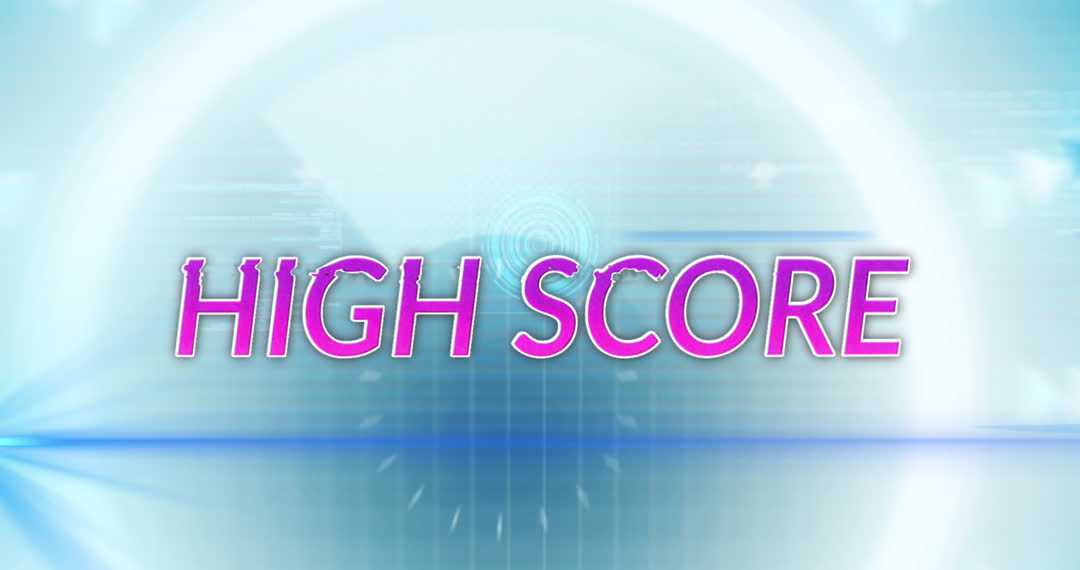 Futuristic animated design featuring 'High Score' in bold purple lettering set against digital interface elements. Useful for video game design interfaces, scoreboard overlays, high-tech digital presentations, or promotional material reflecting gaming themes and accomplishments.