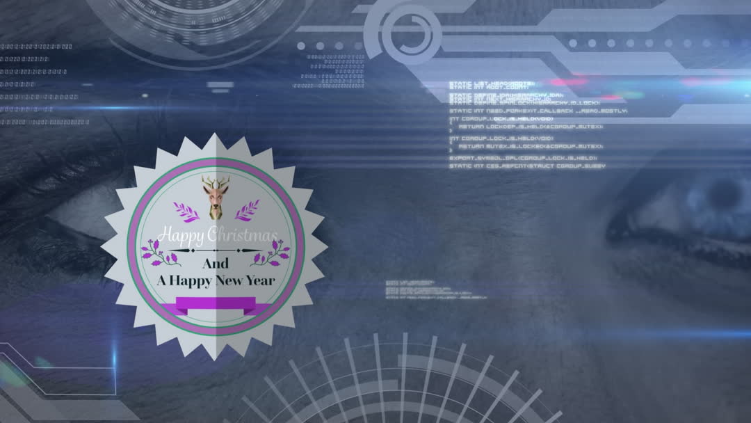 This visual presents a unique blend of a holiday message integrated with digital, futuristic elements and abstract tech graphics overlaying human eyes. Ideal for innovative holiday greetings, tech-themed seasonal campaigns, or electronic invitation designs combining festive themes with high technology visuals.