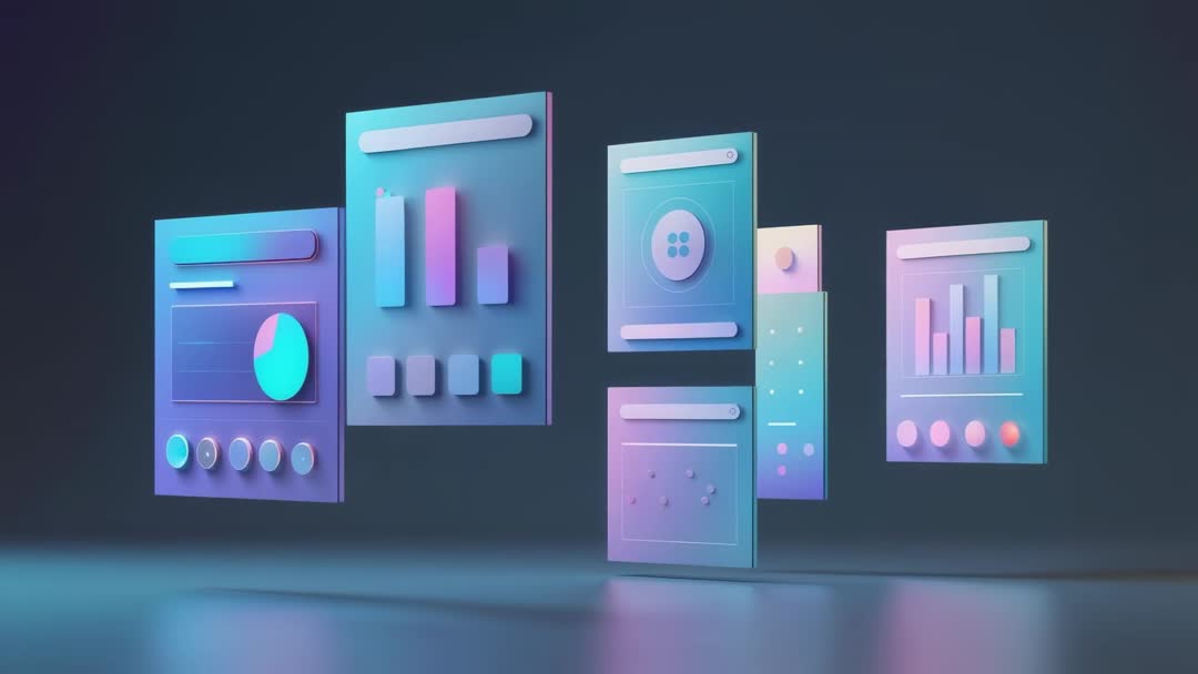 AI Generated Image. This video showcases six floating holographic panels displaying various types of charts and graphs, set against a dark studio background with neon glow accents. It highlights futuristic interface design ideal for promoting technology solutions, digital innovations, or AI applications. Suitable for marketing material, websites, or presentations focused on cutting-edge technology and innovative data visualization approaches.
