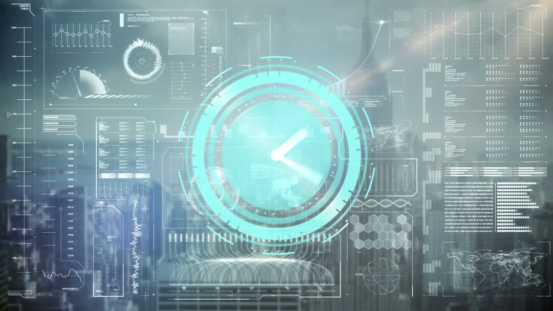 Image displays a futuristic holographic interface with a digital clock over a backdrop of data processing elements and a cityscape. Ideal for illustrating themes related to advanced technology, smart cities, or digital innovation. Could be used in tech magazines, corporate presentations, or websites focused on technological advancements.