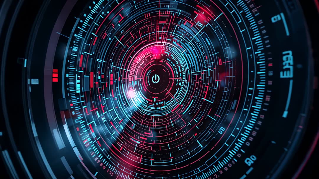 AI Generated Image. Dynamic display showcasing cutting-edge technology interface, ideal for design emphasizing modern tech concepts. Compelling visuals with rotating teal and red segments draw attention to a power icon at the center, making it suitable for materials on data visualization, AI, and future tech presentations.