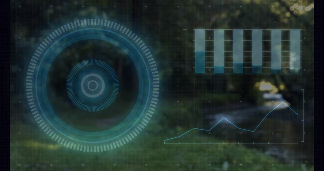 Footage captures digital heads-up display with futuristic data visualization. Scanning graphics overlay nature background depicting analyzing environmental metrics with moving graphs and filling progress bars. Ideal for showcasing high-tech themes related to technology analytics, holographic interfaces, augmented reality applications, and digital innovation.