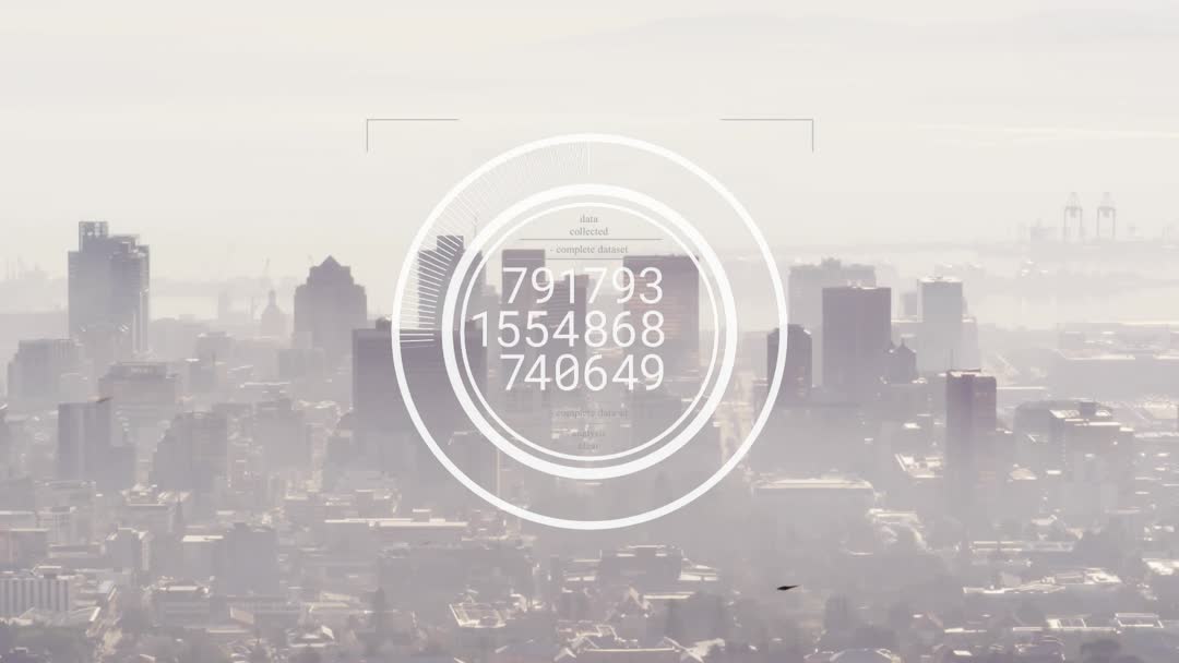 Clip showing aerial view of hazy metropolis with circular HUD overlay displaying numeric readouts and rotating progress bands. Graphic elements floating above highrise cluster, suggesting real-time urban monitoring, data collection, sensor mapping. Visual style using cinematic desaturated tones, creating moody tech-forward atmosphere. Applications including tech presentations, smart city explainer videos, broadcast openers, app demos, corporate pitch decks, urban planning visualizations, air quality and surveillance reports. Delivering layered composition suitable for adding custom branding, lower thirds, animated transitions, voiceover.