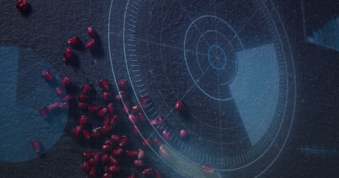 - Futuristic HUD Interface Rotating Over Red Pomegranate Arils on Dark Slate Surface