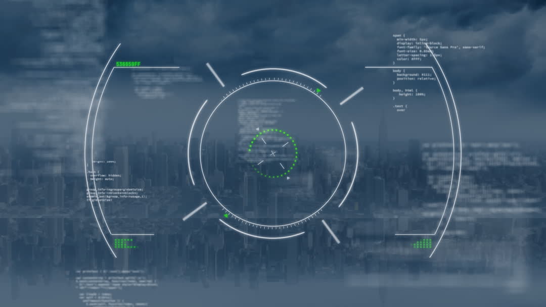 Dynamic animation showcases a futuristic HUD interface scanning over an urban skyline, representing digital technology and data monitoring. Ideal for illustrating concepts related to advanced technology, security surveillance, or global business operations in presentations, promotions, or informational content.