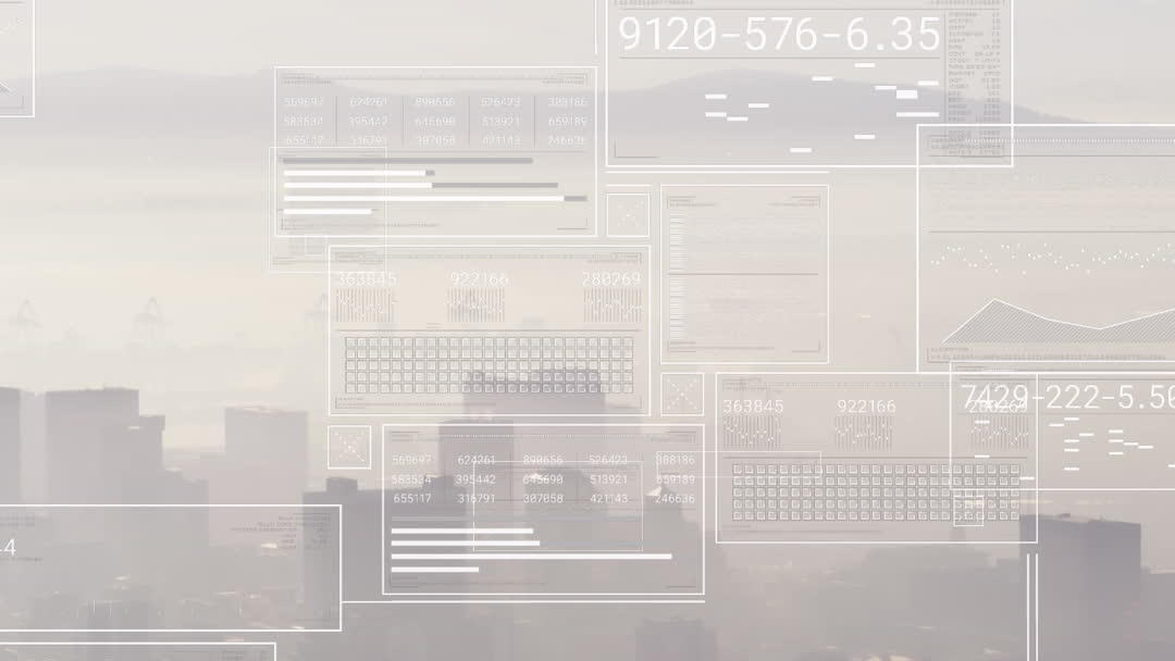 A blend of high-tech HUD interface graphics on a misty city skyline creates a visual representation of digital information flowing across an urban environment. Useful for depicting themes of digital transformation, business analysis, and the influence of technology in metropolitan settings. Ideal for use in business presentations or to illustrate innovative data management concepts.