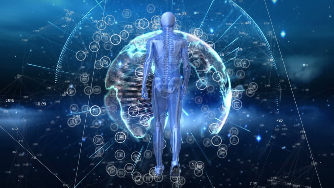 Illustration depicts a transparent human figure with digital overlays and global network implying concepts like human biology, innovative technology, and digital connectivity. Ideal for educational materials, technology-themed articles, or science communication projects.