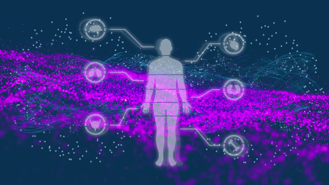 This visual depicts a futuristic holistic concept showing a human silhouette surrounded by data patterns and symbols, symbolizing the integration of technology in healthcare and digital interfaces. Suitable for articles about innovative medical technology, cyber connectivity, healthcare advancements, or digital interface designs. Ideal for illustrating concepts involving digital health solutions or human-data interaction in professional publications.