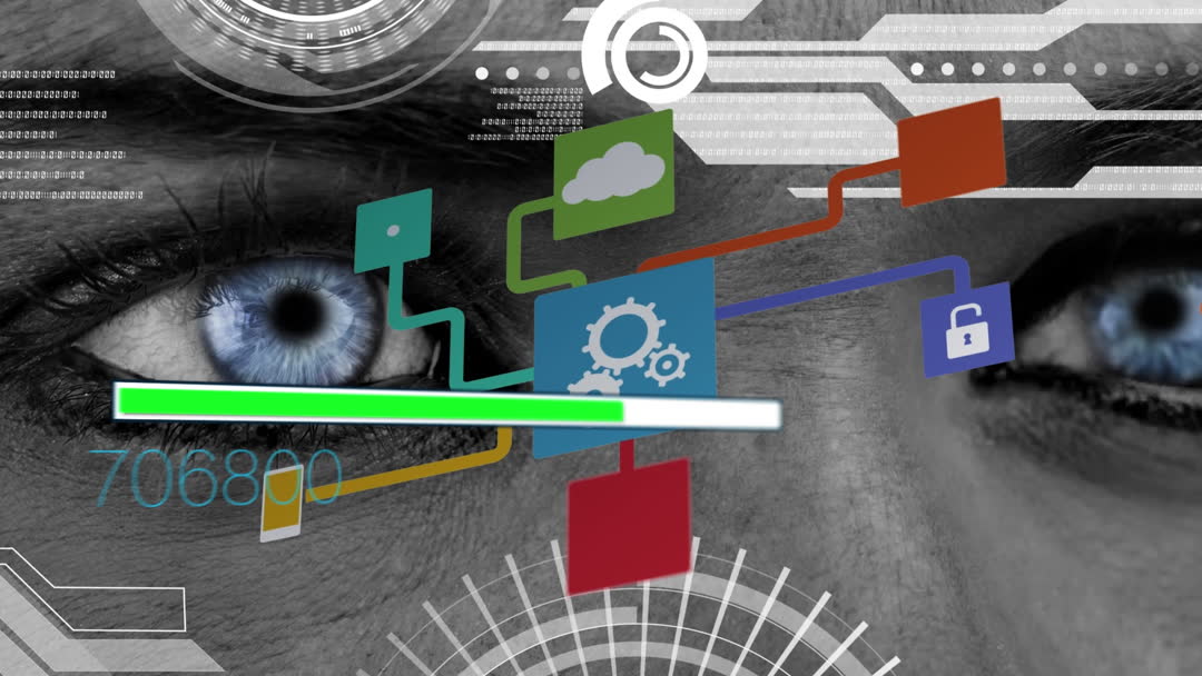 This videory of a human eye integrated with digital network elements such as graphs, gear icons, cloud symbols, and security locks encapsulates the vision of advanced technology and connection. The close-up on the eye reflects association with security, artificial intelligence, and innovation, making it suitable for technology presentations, futuristic advertising, and digital communication media.