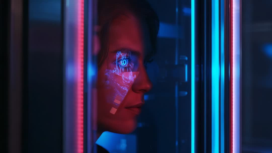 AI Generated Image. This dynamic image captures a woman positioning her face by a scanning device with intricate holographic displays that suggest advanced digital security measures. The vivid hues of blue and red add a cyberpunk aesthetic, enhancing the futuristic feel. Ideal for illustrating concepts of identity verification, high-tech security, robotics, or digital innovation in presentations, media projects, and creative designs