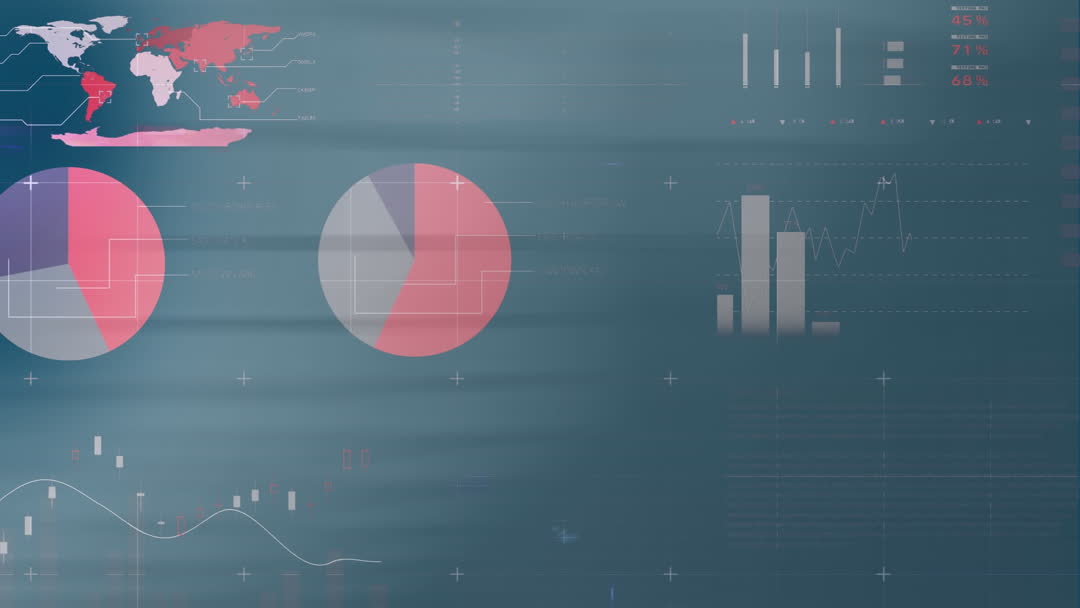 Dynamic visualizations with multicolored charts, graphs, and maps indicating progress and global insights in a business context. Used for presentations on business development, reviewing analytical data, explaining financial growth, or illustrating technological advancements. Effective for showcasing progress in report settings.