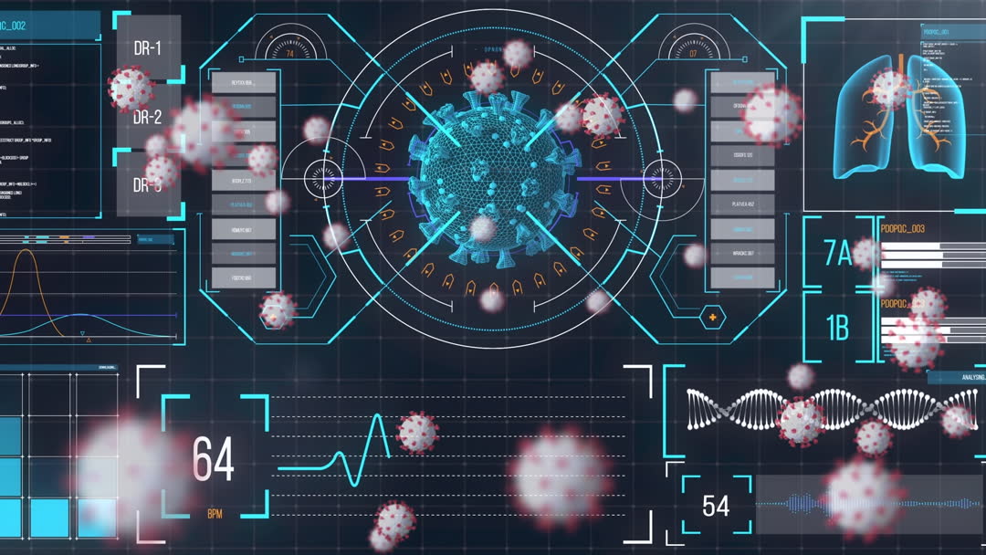 Digital animation shows futuristic interface with COVID-19 virus representation and data processing elements. Ideal for illustrating medical research, advancements in healthcare technology, and pandemics for educational content or scientific presentations.