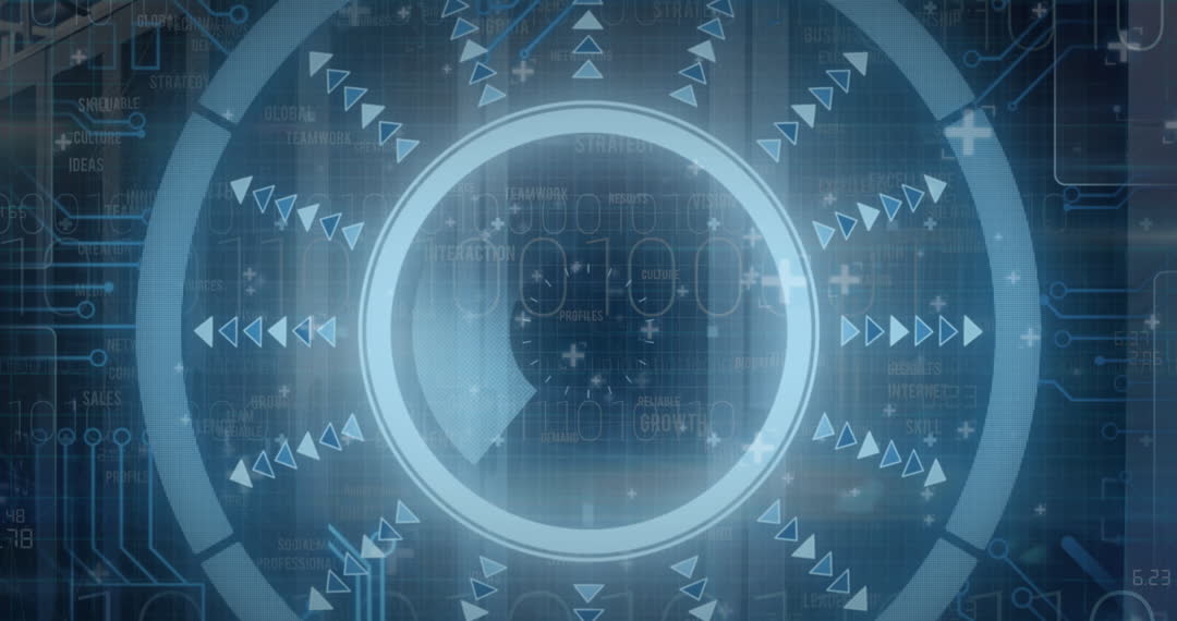 Abstract video illustrating futuristic digital technology. Features circular scanner overlaying microprocessor connections and business-related words. Suitable for presentations, tech-themed websites, and innovation concept visuals embracing digital advancement.