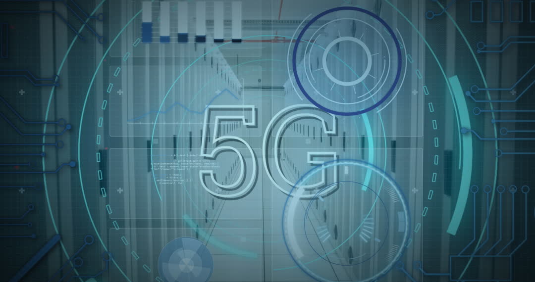 Graphic showcasing digital 5G interface overlay on server room, emphasizing advanced network technology and high-speed connectivity. Useful for technology-themed presentations, articles on communication advancements, or promotional material for digital innovations and infrastructure.