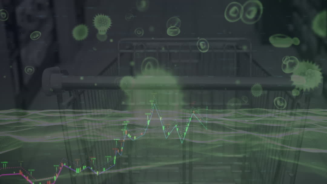 Abstract scene overlaying a shopping cart with digital elements and holographic financial data, highlighted by a gradient design with illustrious waves and virus icons. Ideal application for themes exploring technology in retail, financial analytics tools, health and safety during shopping, or futuristic marketing strategies. Captures innovative use of data overlay to connect real-world shopping contexts with greater analytics insight.
