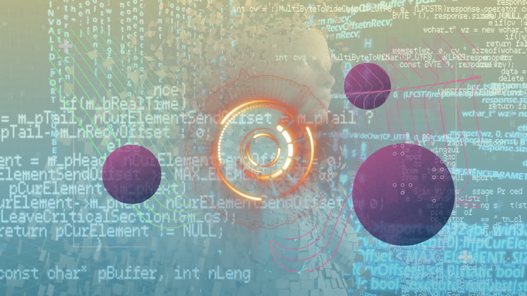 Abstract digital collage with futuristic interface features scanning overlays paired with coding elements. Suitable for illustrating tech innovations, cybersecurity themes, data processing trends, and programming advancements. Useful for reports, technology blogs, and presentations on digital advancements or software development.