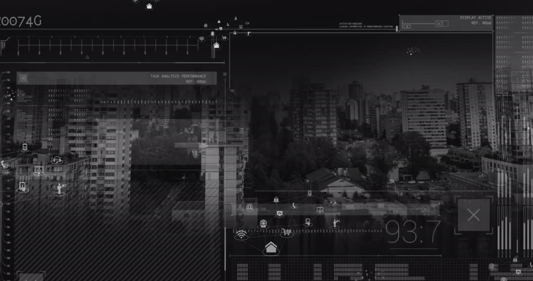 Gray-scale fusion of technology and urban living with informational icons overlaying a city view. This video is ideal for representing digital transformation in urban environments, futuristic cities, or global technology in marketing materials and presentations.