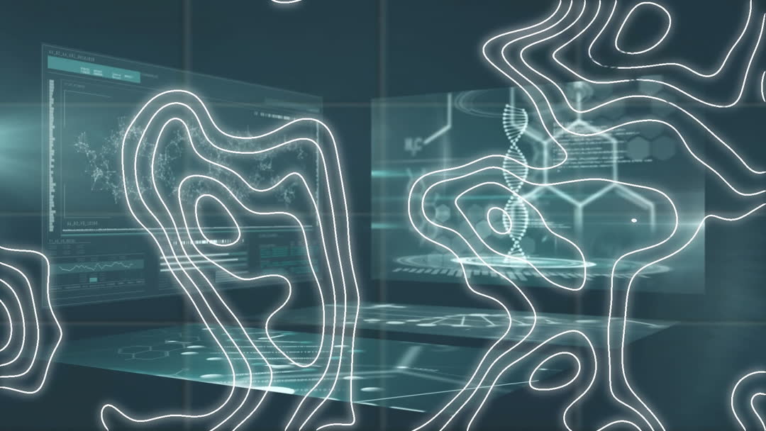 Digital interface featuring animated white lines moving over complex data visuals represents technological advancements in science and human biology. Suitable for illustrating innovative technology, modern design concepts, and educational materials on data analysis and scientific research.