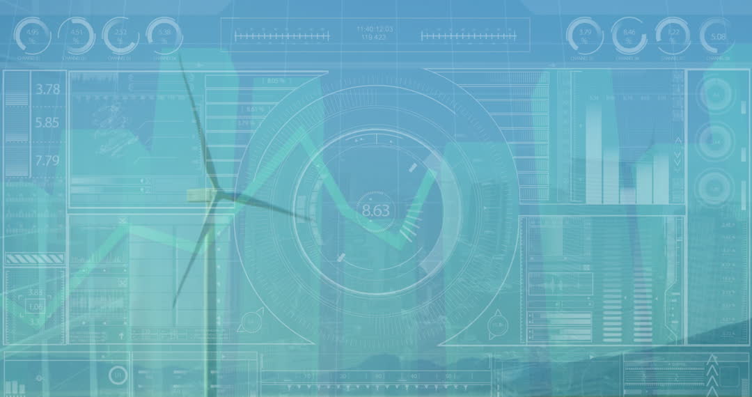 Futuristic design combining a wind turbine with a digital data interface, symbolizing technology and sustainable energy production. Perfect for highlighting themes of innovation, renewable energy strategies, economic growth, and digital development in reports, presentations, or videos.