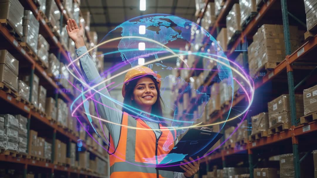 AI Generated Video. Scene shows female supervisor interacting with holographic interface in a modern warehouse. With shelves of boxes in the background, it highlights advanced technology integration for inventory management and logistics. Ideal videory for articles on logistics innovation, advancements in warehouse technology, and AI-driven business solutions.