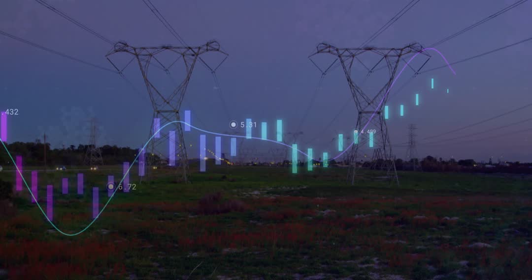 A dynamic representation of market trends overlays a night landscape under power lines. The combination of growing and shrinking bars symbolizes fluctuating market data. Perfect for illustrating industrial technological developments, financial growth projections, or research presentations.
