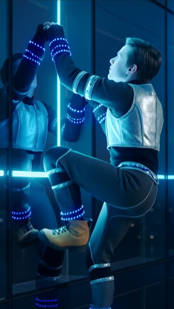 AI Generated Video. Featuring performer in metallic silver vest climbing mirrored wall lit by pulsing LED strips and neon cyan accents. Vertical framing emphasizing upward movement and reflection, capturing dramatic reach toward top. Costume details including LED wrist bands and tech-inspired trim, reinforcing cyberpunk aesthetic. Lighting creating high-contrast cool tones suitable for futuristic themes. Usage ideas: Suited for mobile-first content such as TikTok, Instagram Reels, Snapchat stories, vertical display ads. Serving as promo clip for live shows, dance companies, stunt showcases, technology conferences, music videos, fashion films. Working well as loopable background for VJ sets, club visuals, product launches, motion design projects. Editors trimming for short form ads, adding text overlays, syncing to electronic music, and applying color grades for brand cohesion.