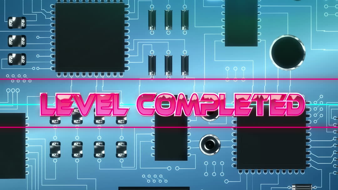 This graphic showcases a vibrant 'Level Completed' interface reminiscent of retro video games, superimposed over an abstract electronic circuit background. Ideal for gaming platforms celebrating achievements, or for content related to level progression, digital themes, or interactive entertainment. The striking neon pink text enhances its appeal for modern settings related to technology, design, and virtual environments.