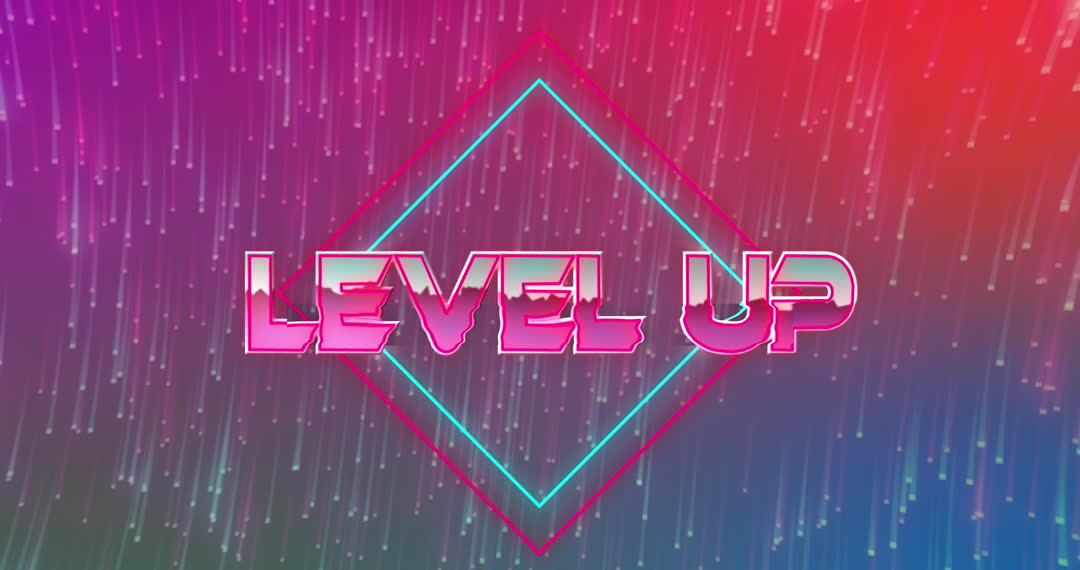 Bright metallic pink letters with 'Level Up' text inside a glowing diamond outlined in blue give a vibrant, futuristic look. The background is filled with cascading lines and points reminiscent of rain in neon settings. Useful for gaming events, neon cyber themes, digital art displays, or promotional materials related to video game advancements or events.