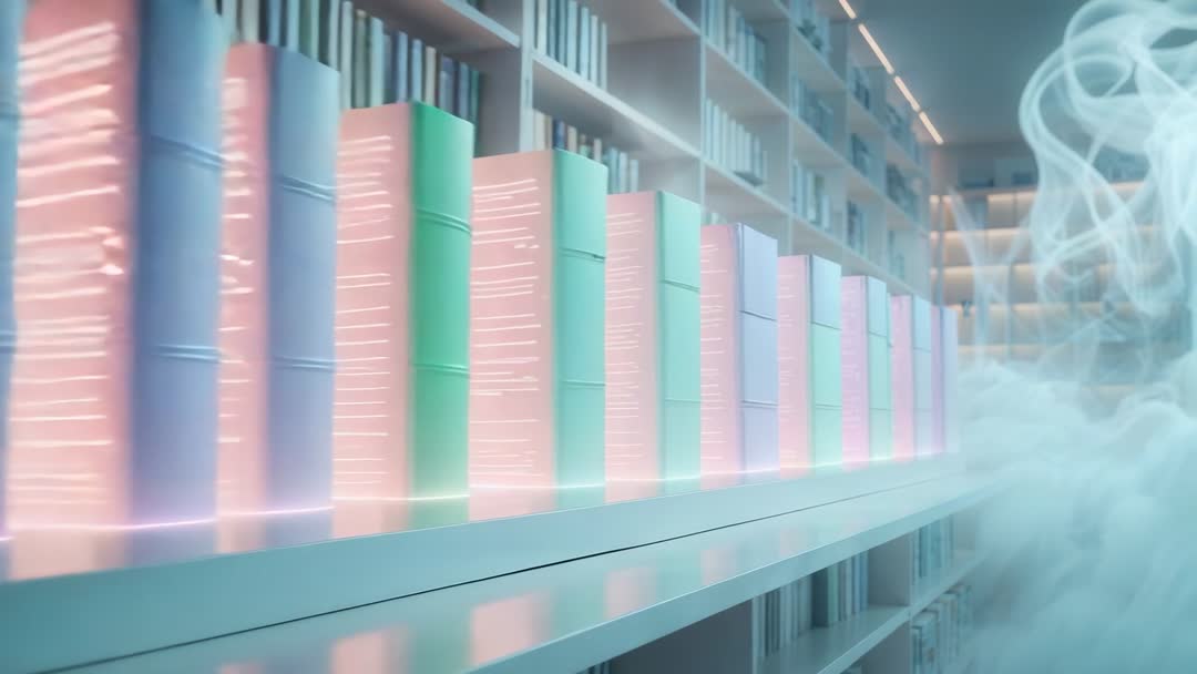 - Futuristic Library of Glowing Pastel Books in Ethereal Atmosphere