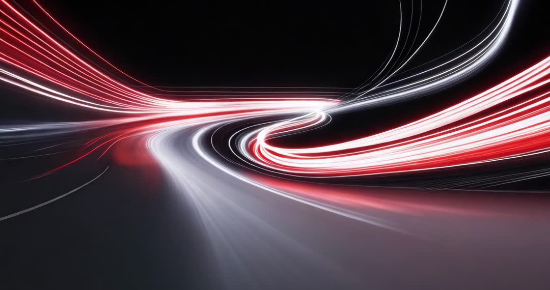 AI Generated Image. This visual captures dynamic red and white light trails on a dark, curving road, conveying a high-speed, futuristic ambiance often found in digital art and visual effects. Ideal for use in projects that highlight motion graphics, sci-fi themes, or transport of modern energy concepts. Useful for backgrounds in advertisements, tech presentations, or video productions emphasizing forward movement and evolution.