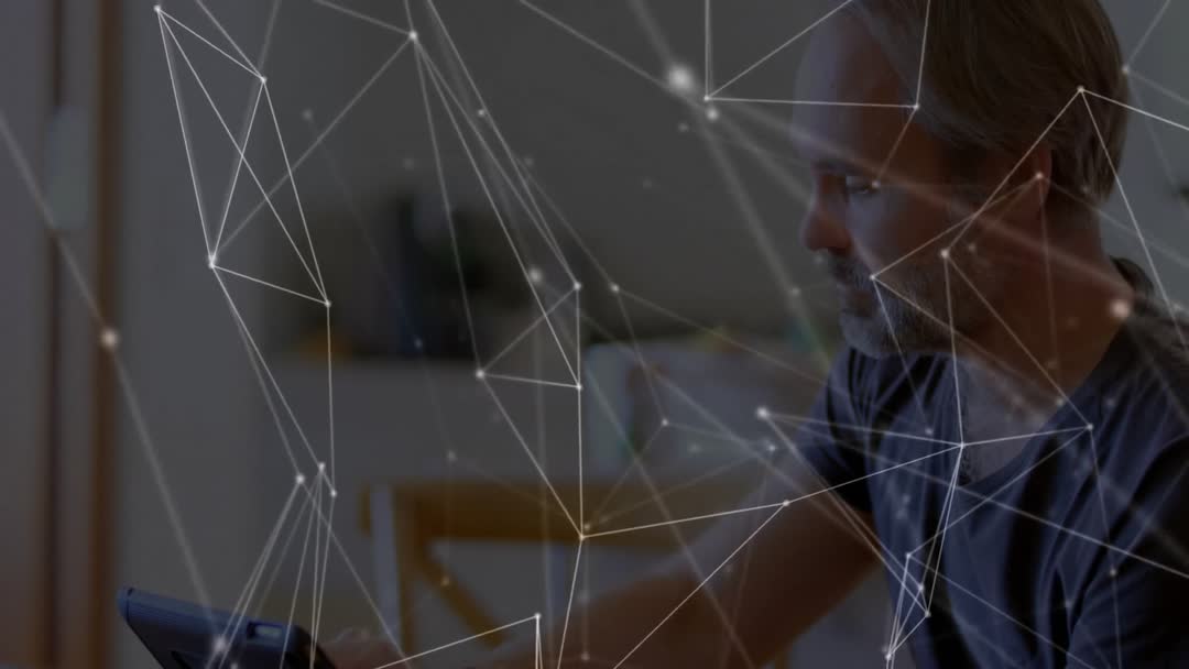 Man tapping on a tablet with a visual representation of a digital network overlay appearing around him. Perfect for illustrating technology blogs, digital innovation articles, and businesses focused on futuristic interfaces. Highlights concepts of connectivity and high-tech interaction. Suitable for promotions on modern tech solutions and conferences for digital transformation.
