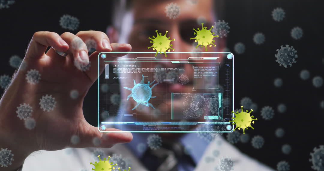 Digital video features a medical professional interacting with a virtual interface depicting futuristic data visualization and virus analysis. This can be used to illustrate concepts related to advanced healthcare technology, biomedical research, or innovations in digital healthcare applications.